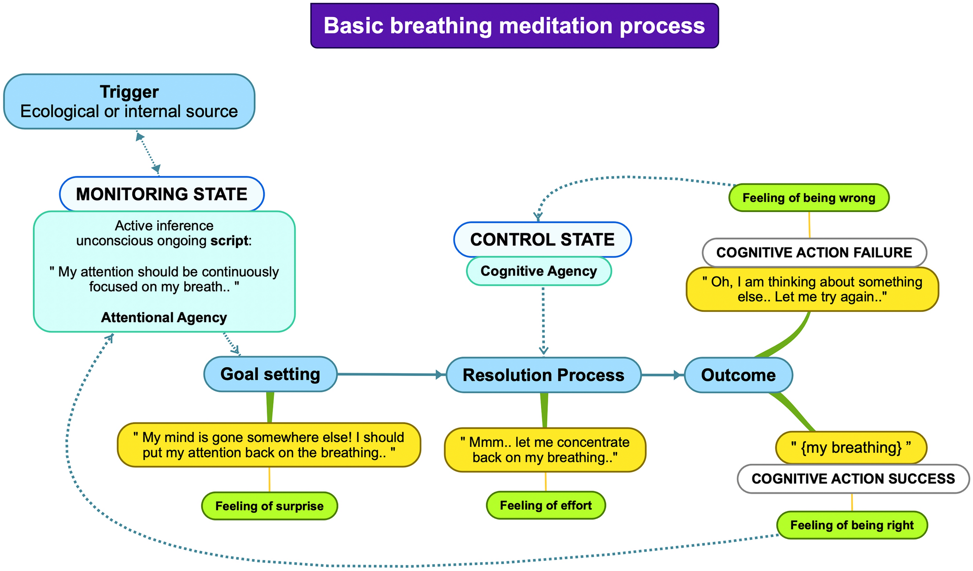 This process follows a standard cognitive action model in which metacognitive feelings are heavily recruited. For example, while being present and monitoring their mind, someone can suddenly realize that their focus of attention has drifted away. This expresses itself as a metacognitive feeling of incoherence (“oh, something is wrong”), which makes the individual meta-aware about their ongoing activity (“I caught myself thinking about grocery but in fact I am meditating”) and the related need to bring their attention back to the target of the meditation (“while I meditate, I am supposed to keep my attention on my breath”). This in turn activates the control function of metacognition, creating a feeling of effort that is related to manipulating one’s attentional focus. Reallocating attentional focus makes the individual experience a metacognitive feeling of having attained the goal, which in turn expresses itself as a positive feeling of relaxation related to the completion of the cognitive action and gives space to the monitoring process once again. The extent to which psychoeducation interventions in metacognitive feelings could be proposed to help people progress in their meditation practice is outside the scope of this article.