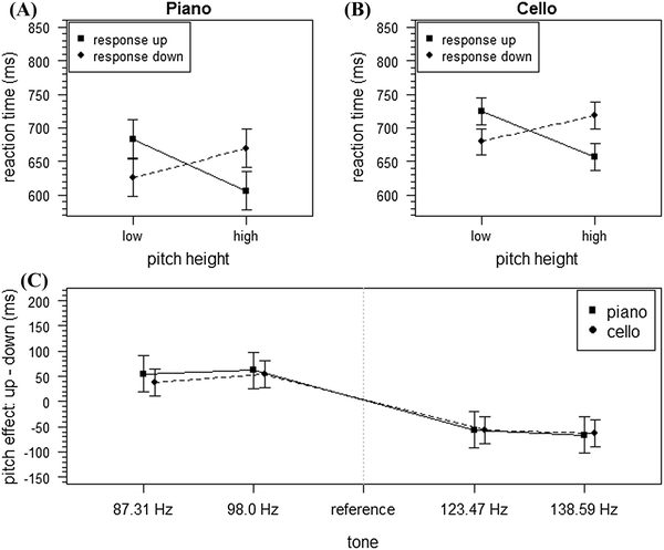 Results of Experiment 2. Mean reaction times (ms) of correct responses for a piano and b cello as a function of pitch height and response direction. Pitch effect as a function of instrument and tone (c). Error bars represent the 95% confidence interval for within-subject designs (Masson & Loftus, 2003)