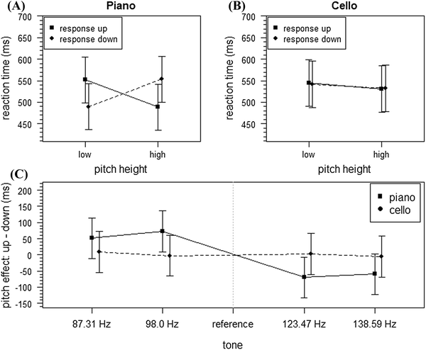 Each target tone was presented 20 times. Thus, for each participant 80 randomly presented trials per one of the four counterbalanced blocks were obtained, resulting in a total number of 320 trials (160 trials for piano, 160 trials for cello). The study was a full factorial 2 × 2 × 2 within-subject design with the factors “pitch height” (lower or higher compared to reference tone), “response direction” (up vs. down) and “instrumental context” (cello vs. piano).