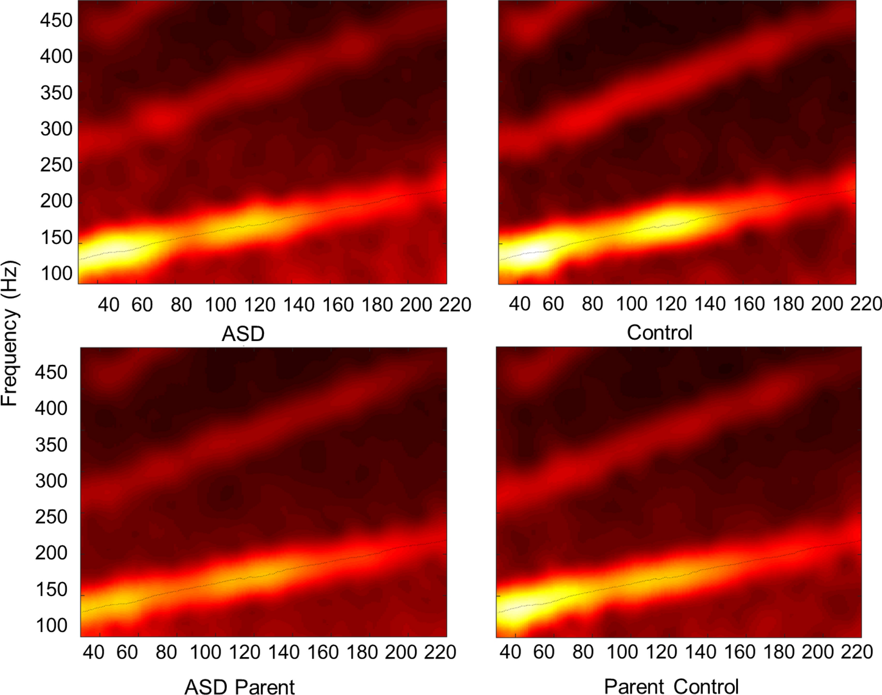 Prior work identifying relationships between prosody, auditory and speech processing, and pragmatic language in ASD and typical development demonstrates that neural auditory processing impacts vocal production (Chen et al., 2007; Liu et al., 2010; Patel et al., 2019; Russo, Larson, et al., 2008; Russo, Trommer, et al., 2008). In typical development, evidence suggests that processing of auditory feedback impacts language production, including key aspects of speech like suprasegmentals, which are an area of speech atypicality associated with ASD (Chen et al., 2007). Chen et al. (2007) further concluded that this may be a reflection of linguistic ability and specific neural mechanisms which are similarly impacted in ASD. In a study implementing a pitch-perturbed auditory feedback task among individuals with ASD, during which participants heard their voice in real-time as they vocalized, individuals with ASD and their parents overcorrected for pitch perturbations and produced an even lower or higher pitch than expected relative to controls (Patel et al., 2019). The increased response magnitudes indicated less efficient audio-vocal integration and were closely related to listener-ratings of prosodic abilities. Furthermore, the audio-vocal integration differences were reflected in differences in event-related potential analyses as well (Patel et al., 2019). Close associations between these language domains and neural atypicalities in individuals with ASD and their first-degree relatives suggest heritable mechanisms underlying ASD-related language impairments. Building on this work, the present study investigated neural processing of speech sounds in individuals with ASD and their biological parents, by studying the frequency following response (FFR).