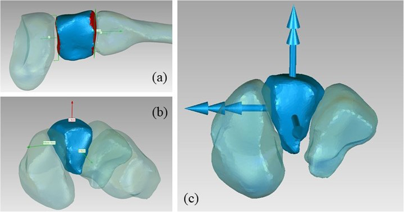 Definition of the intermediate cuneiform ARS: a) x axis definition; b) y axes definitions; c) final ARS
