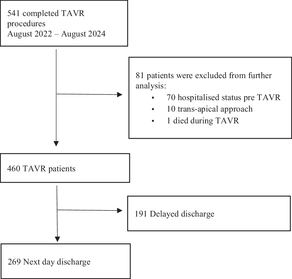 A next-day discharge policy was introduced in 2022 at St. Antonius Hospital Nieuwegein, the Netherlands. We included elective TAVR patients between August 2022 and August 2024, excluding those with pre-existing hospitalisation, transapical access, or intraprocedural mortality.