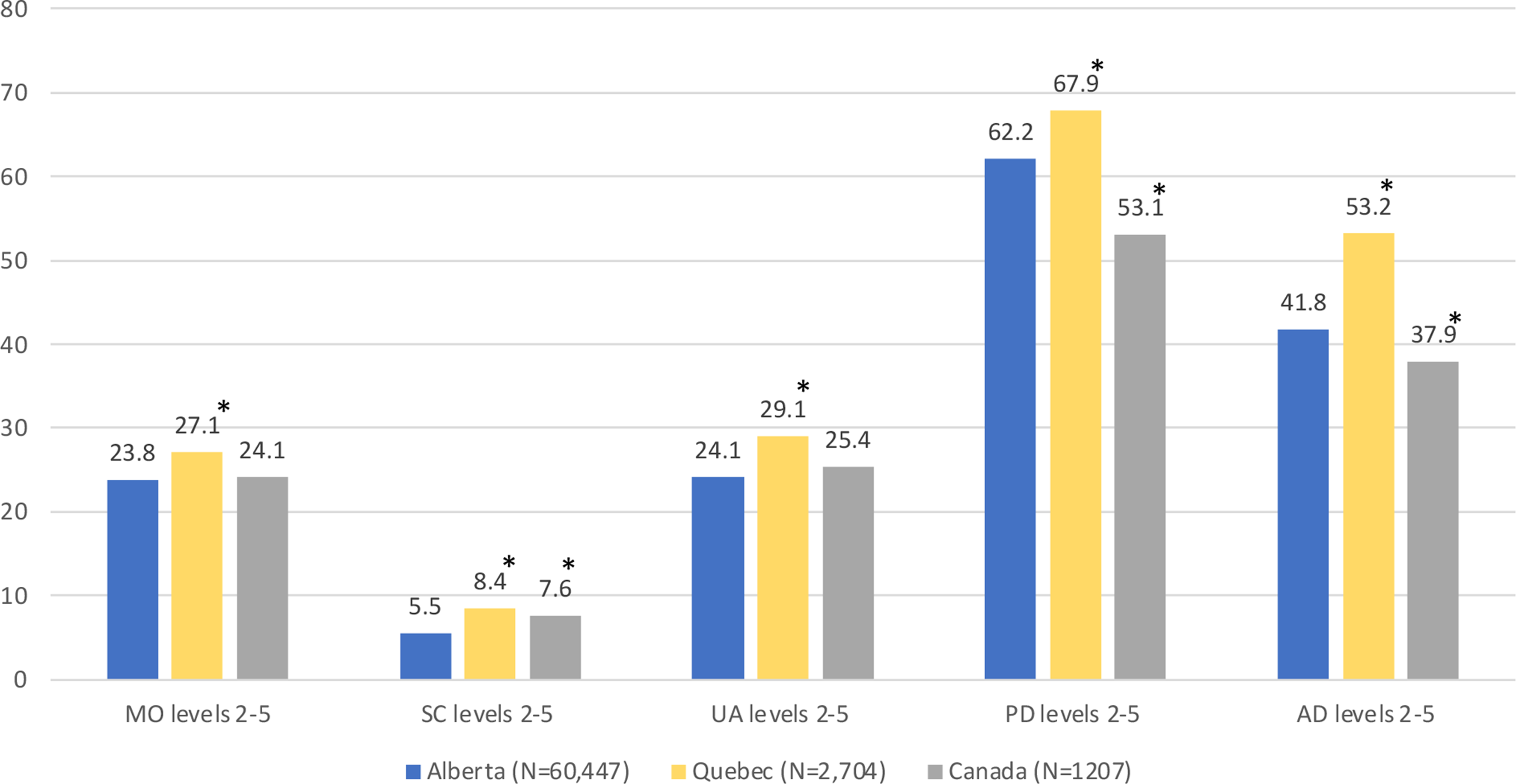 We explored weighted EQ-5D-5L dimensions in the whole population and then in terms of age group (18–24, 25–34, 35–44, 45–54, 55–64, 65–74, ≥ 75 years), sex (male, female), health zones (urban zones: Calgary, Edmonton; rural zones: South, North; sub-urban zone: Central) and 17 chronic conditions. Further, we estimated weighted EQ-5D-5L index and EQ VAS scores. In further analysis, level 1 on each dimension of the EQ-5D-5L was labeled as “no problems” and levels 2–5 were combined into “present problems”. Finally, we compared EQ-5D-5L population norms in Alberta to those reported in 16 other jurisdictions and countries, including the province of Quebec and national Canadian norms. To assess differences in the proportion of reported problems across EQ-5D-5L dimensions across sub-groups, we employed the chi-square test. For comparing differences in EQ-5D-5L index scores and EQ VAS scores across subgroups and between Alberta and other jurisdictions/countries, we used Welch’s t-test and one-way ANOVA as appropriate.