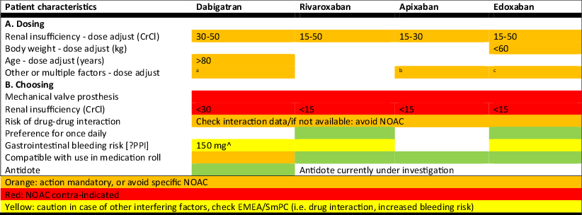 Dosing (A) and choosing (B) a NOAC in atrial fibrillation. The proposals voiced here are not based on head to head comparisons of the four NOACs but are derived from European labelling (EMA, and related SmPCs) and current ESC guidelines on AF. AF atrial fibrillation, BID twice daily, CrCl creatinine clearance, EMA European Medicines Agency, ESC European Society of Cardiology, NOAC non-vitamin K antagonist oral anticoagulant, P-gp P-glycoprotein, SmPC summary of product characteristics, aVerapamil, bIf 2 out of 3: age ≥80 years, weight ≤60 kg, serum creatinine ≥133 µmol/L cStrong P‑gp inhibitor (excluding verapamil), check EMEA/SmPC, dPPI Consider proton pump inhibitor, ePreference for 110 mg BID in case of gastritis/oesophagitis
