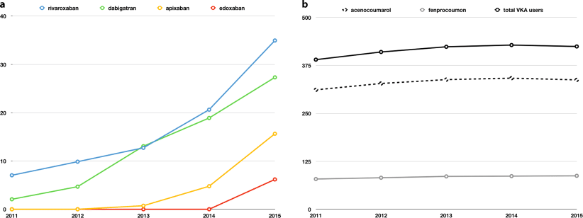 Kilickiran Avci B, Vatan B, Tok OO, et al. The trends in utilizing nonvitamin K antagonist oral anticoagulants in patients with nonvalvular atrial fibrillation: a real-life experience. Clin Appl Thromb Hemost. 2015;22(8):785–91.CrossRefPubMed