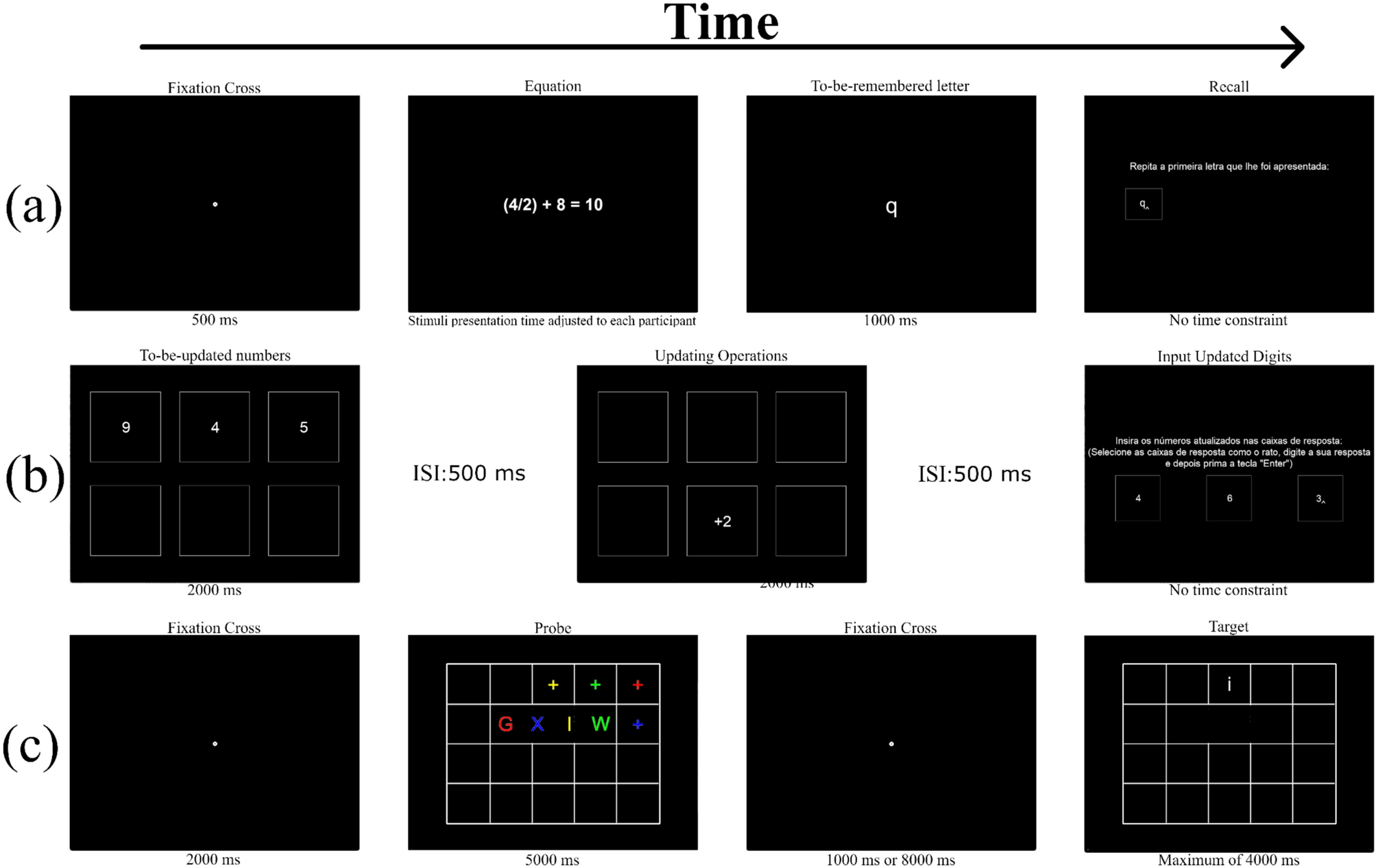Diagram illustrating some of the tasks featured in the OpenWMB. a Operation span; b working memory updating task; c binding and maintenance task; ISI, interstimulus interval
