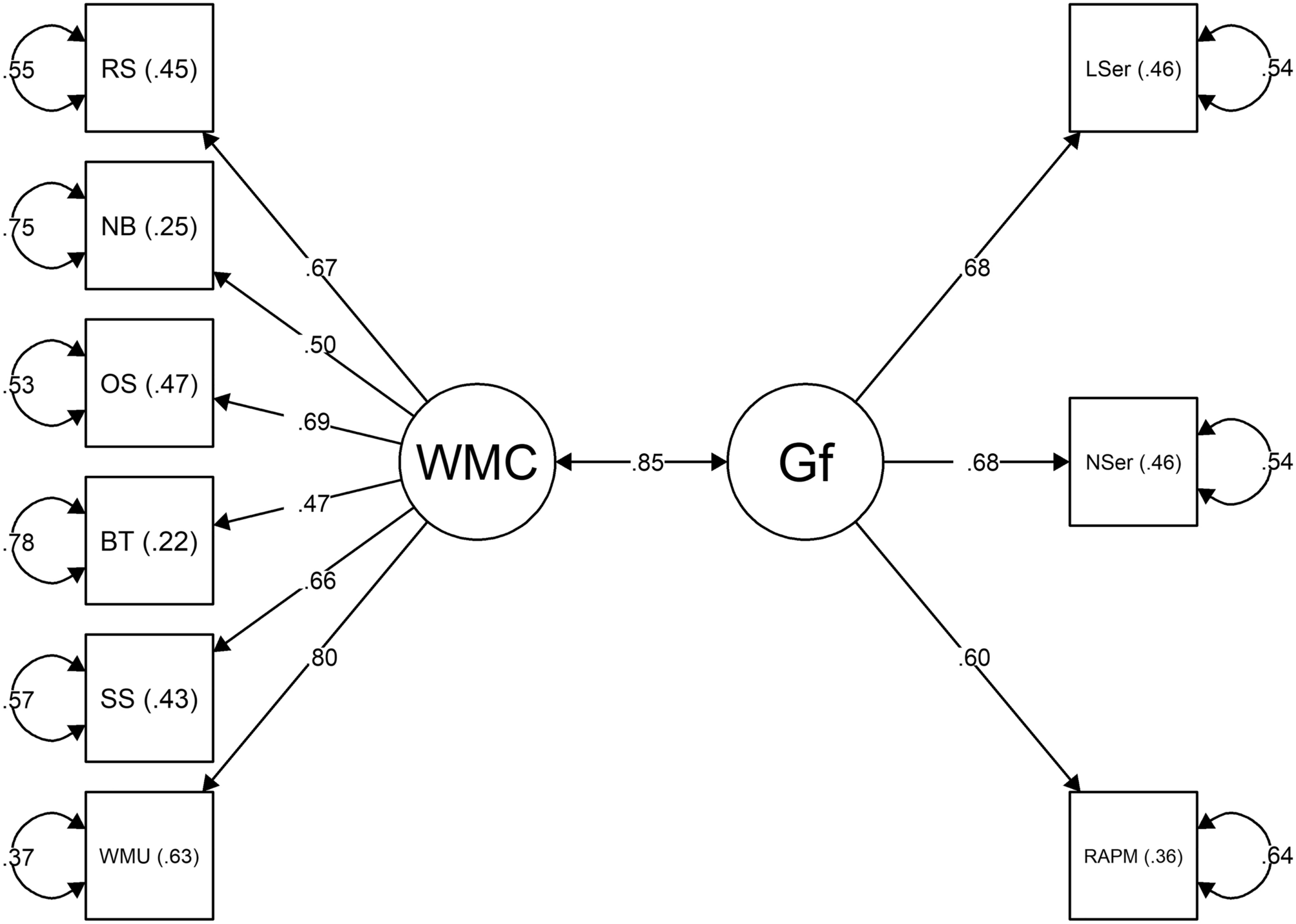 Model 1: SEM assessing the relationship between the Gf measures and the full-length versions of the WM tasks at a latent level. Circles represent latent factors. Rectangles represent manifest variables. Curved arrows represent standardized error terms. RS reading span, OS operation span, SS symmetry span, NB n-back task, WMU working memory updating task, BT binding and maintenance task, WMC working memory capacity, Gf fluid intelligence, LSer letter series, NSer number series, RAPM Raven’s Advanced Progressive Matrices