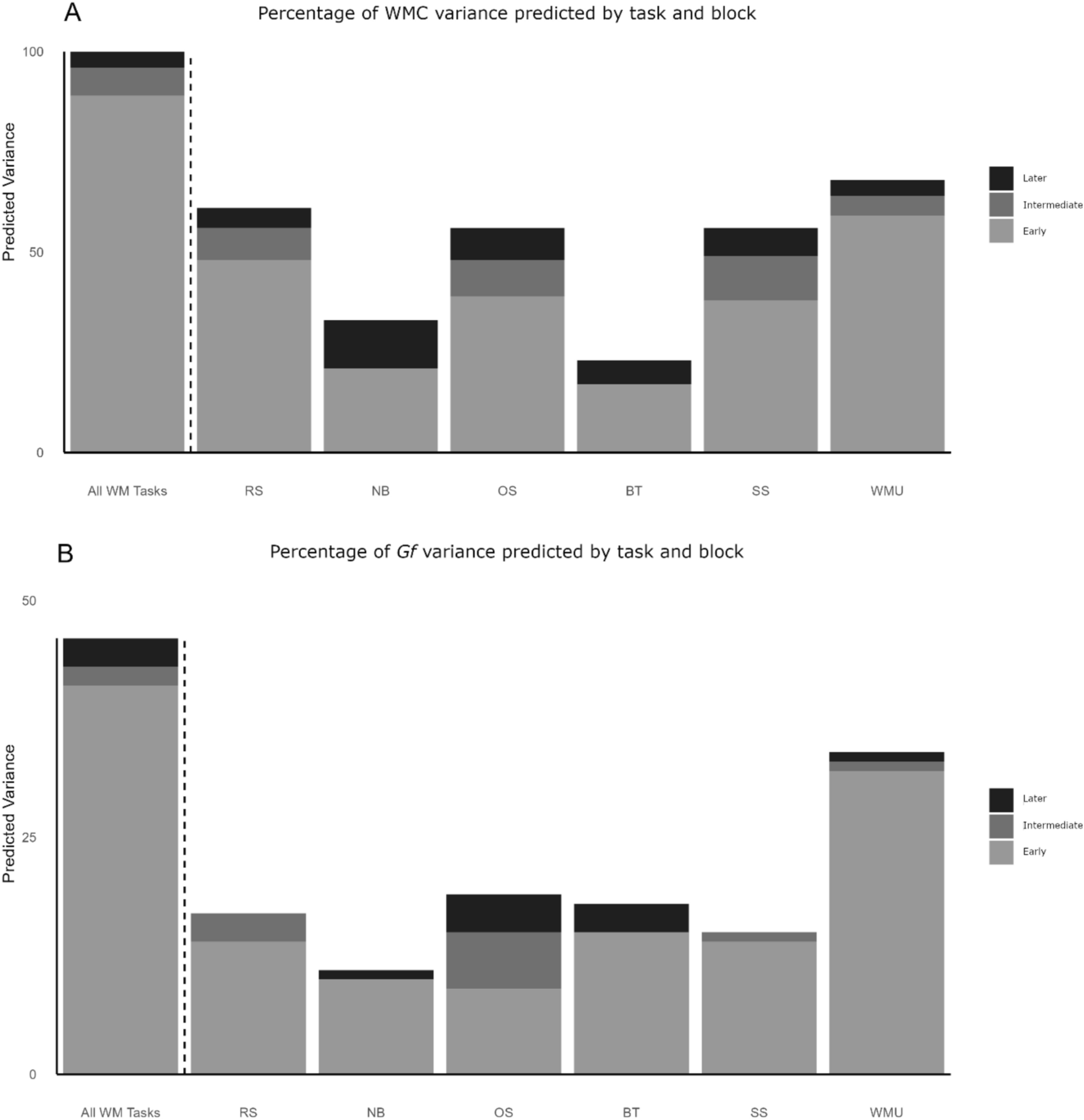 Additionally, we sought to assist researchers in selecting the most suitable combinations of tasks and trial blocks in future studies. Our goal was to identify the configurations that maximized the information extracted from WM tasks while minimizing administration time. To this end, we performed a permutation analysis in which we calculated and compared the amount of Gf and WMC variance predicted by every possible combination of blocks (early, early + intermediate, and early + intermediate + later) and tasks (reading span, operation span, symmetry span, n-back task, working memory updating task, and biding task) and the time required to administer each combination.