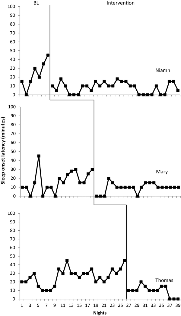 Self-report may have also impacted IOA data reliability. While parents may have influenced each other during data collection, there are no data indicating this. Future studies could use videotaping or digital devices registering physiological activity as an alternative method of collecting IOA data. Sleep diaries do present a number of benefits. The primary benefit was inclusion of data on events outside the bedroom (e.g. illness, staying in grandparents, etc.). This was valuable in terms of identifying extraneous variables which may have impacted adherence and efficacy. Future research should investigate the use of more objective measures of sleep and the reliability, accuracy and validity of parent-completed sleep diaries.