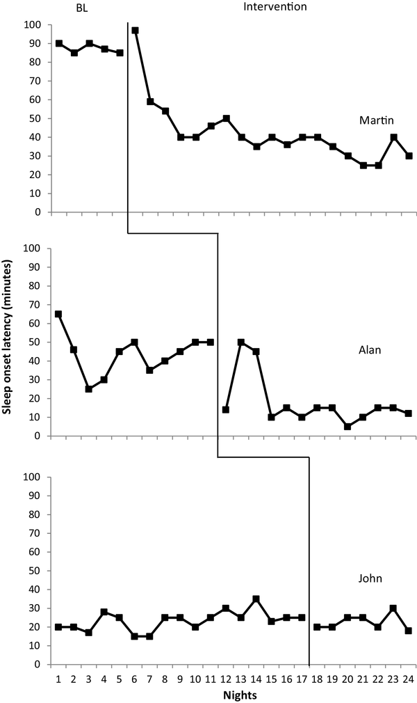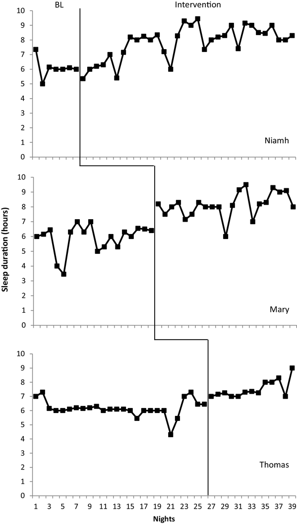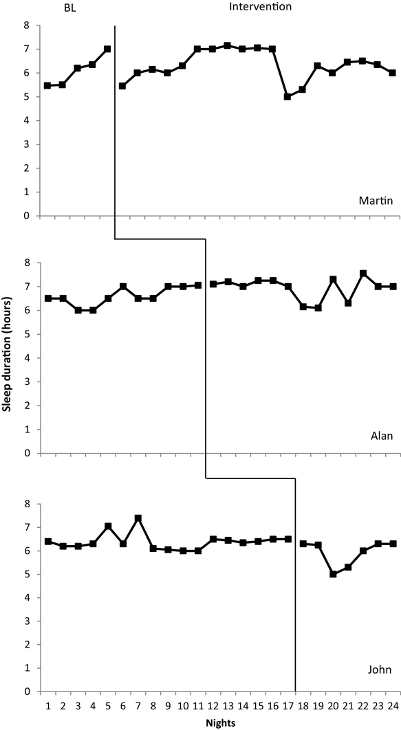 Once an increase of total sleep duration of 1 h and a sleep onset latency of below 15 min was demonstrated by participant 1 for two consecutive nights the intervention was implemented for participant 2 (stage 1 and 2 of this procedure).