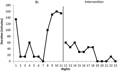 Total duration interobserver agreement (IOA) was conducted for the purpose of reliability. This was assessed by having both parents independently observer and score the child for each of the primary dependent variables during baseline and intervention. This has been found an effective strategy for sleep research within the home setting (Mindell et al. 2006). IOA was calculated by dividing the shorter duration by the longer duration and multiplying this by 100. IOA was calculated for 42% of nights and was 100% (range 100–100) both at baseline and intervention. Mean IOA was 100% (range 100–100) for total sleep duration, 100% (range 100–100) for sleep onset latency, and 100% (range 100–100) for night wakings.