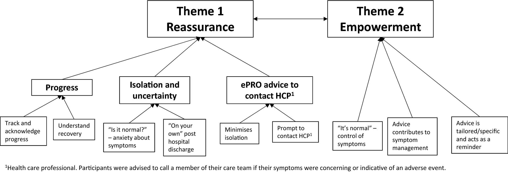 Thirty-five interviews with 16 participants (11 men, mean age 63 years) were analysed. Two main themes were identified: (1) reassurance and (2) empowerment. Feelings of isolation were common; many patients felt uninformed regarding their expectations of recovery and whether their symptoms warranted clinical investigation. Participants were reassured by tailored feedback advising them to contact their care team, alleviating their anxiety. Patients reported feeling empowered by the ePRO system and in control of their symptoms and recovery.