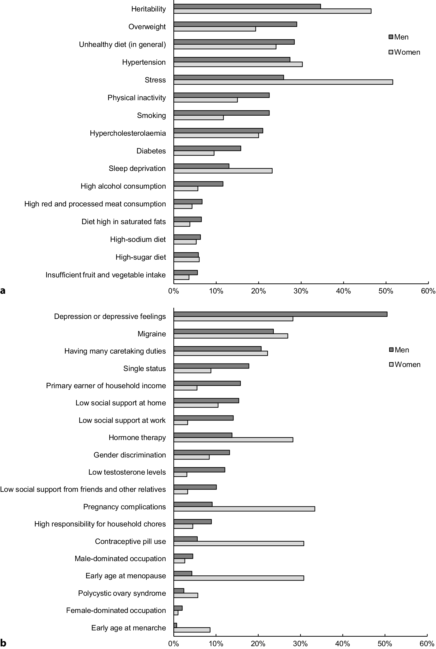 a, b Prioritisation of cardiovascular risk factors for further research (in percentages), by men and women, ordered from high to low (based on men). a Conventional risk factors. b Sex- and gender-related risk factors