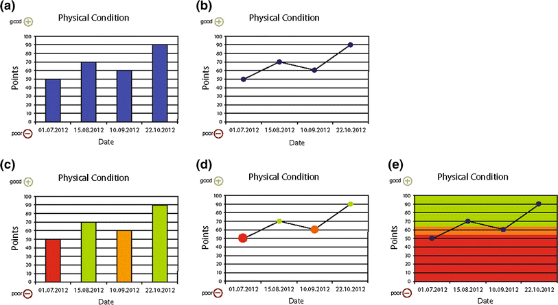 We introduced the five graphs (both non-colored and colored; Fig. 2a–e) and asked the respondents to rank them in order of preference. Each respondent was then shown graphs with data for four assessment points for the QLQ-C30 physical functioning and fatigue scales in the format which (s)he had indicated was his/her first preference. The questions to assess professionals’ objective and subjective understanding of the graphically presented QLQ-C30 data were identical to those posed to patients. We also asked for their preference regarding different directional indicators and provided space for general comments.