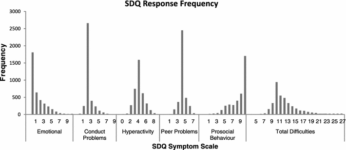 The mean (SD) for SDQ total difficulties and prosocial behaviour scores was 12 (3.2) and 8.3 (2.1), respectively, which are classified as ‘slightly raised’ and ‘close to average’. The mean (SD) for SDQ subscales emotion, conduct, hyperactivity, and peer problems was 1.5 (2.0), 2.3 (1.0), 4.1 (1.3), and 4.1 (0.9). As a point of reference, the mean (SD) of SDQ subscales of a large community sample is provided in Table 2. Emotion and hyperactivity subscales were classified as ‘close to average’, and conduct and peer problems were ‘slightly raised’. The frequency of responses for each symptom scale is reported in Fig. 1.