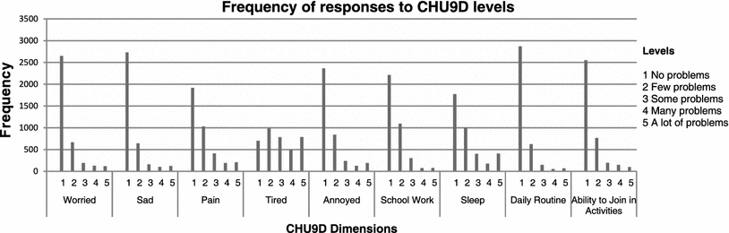 The mean (SD) utility scores were 0.84 (0.11) and 0.80 (0.13) based on the original and alternative tariffs. These scores are commensurate with reported population health utility values [39, 53]. With both scoring algorithms, approximately 5.72 % of participants were classified in full health (i.e. utility = 1). In all dimensions of the CHU9D except ‘tired’, no problems were most commonly reported. Figure 2 reports the frequency of responses to all levels.