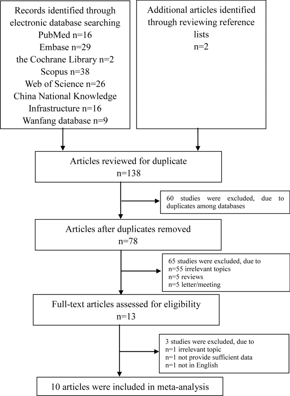 We first conducted a systematic search and identified 16 studies from PubMed, 29 studies from Embase, two studies from the Cochrane Library, 38 studies from Scopus, 26 studies from the Web of Science, 16 studies from China National Knowledge Infrastructure, nine studies from the Wanfang database, and two additional studies from the scanning of references. After reviewing titles and abstracts, 13 papers on peripheral blood S100B levels in ASD were selected for full-text review. Subsequently, one study was excluded due to its irrelevant topic. One report without sufficient data was excluded. One report was excluded for not being published in English. Eventually, 10 studies with 822 participants and 451 cases met the criteria for inclusion in the present meta-analysis (Fig. 1).