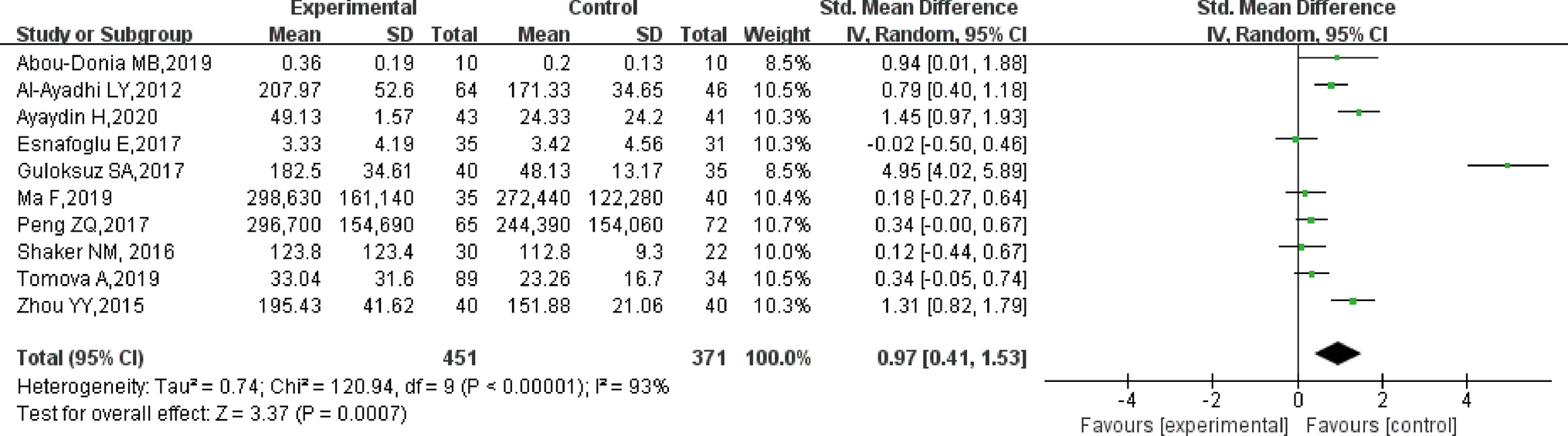The included studies were published from 2012 to 2019 (Abou-Donia et al. 2019; Al-Ayadhi and Mostafa 2012; Ayaydin and Kirmit 2020; Esnafoglu et al. 2017; Guloksuz et al. 2017; Ma et al. 2019; Peng and Zhu 2017; Shaker et al. 2016; Tomova et al. 2019; Zhou 2015) (Table 1). Ten studies encompassed 822 participants and 451 cases. Three studies were performed in China (Ma et al. 2019; Peng and Zhu 2017; Zhou 2015), three in Turkey (Ayaydin and Kirmit 2020; Esnafoglu et al. 2017; Guloksuz et al. 2017), one in the USA (Abou-Donia et al. 2019), one in Saudi Arabia (Al-Ayadhi and Mostafa 2012), one in Egypt (Shaker et al. 2016), and one in the Slovak Republic (Tomova et al. 2019). The sample sizes ranged from 10 (Abou-Donia et al. 2019) to 89 (Tomova et al. 2019). The mean age of participants varied from 1.8 (Peng and Zhu 2017) to 18 (Abou-Donia et al. 2019) years old. The mean S100B values of cases ranged from 0.36 ± 0.19 pg/ml (Abou-Donia et al. 2019) to 298,630 ± 161,140 pg/ml (Ma et al. 2019). Two different biomaterials for S100B assays were used in this systematic review: serum (Abou-Donia et al. 2019; Al-Ayadhi and Mostafa 2012; Ayaydin and Kirmit 2020; Esnafoglu et al. 2017; Ma et al. 2019; Peng and Zhu 2017; Shake 2016; Zhou 2015) and plasma (Guloksuz et al. 2017; Tomova et al. 2019). Moreover, 9 studies performed S100B assessment using enzyme linked immunosorbent assay (ELISA) (Al-Ayadhi and Mostafa 2012; Ayaydin and Kirmit 2020; Esnafoglu et al. 2017; Guloksuz et al. 2017; Ma et al. 2019; Peng and Zhu 2017; Shaker et al. 2016; Tomova et al. 2019; Zhou 2015) as an analytical procedure, whereas 1 adopted Western blot (WB) (Abou-Donia et al. 2019). In addition, ten studies considered gender and age as adjusted confounders (Abou-Donia et al. 2019; Al-Ayadhi and Mostafa 2012; Ayaydin and Kirmit 2020; Esnafoglu et al. 2017; Guloksuz et al. 2017; Ma et al. 2019; Peng and Zhu 2017; Shaker et al. 2016; Tomova et al. 2019; Zhou 2015). Two studies considered body mass index (BMI) as adjusted confounder (Esnafoglu et al, 2017; Guloksuz et al, 2017). One study considered socioeconomic status as adjusted confounder (Shaker et al. 2016).
