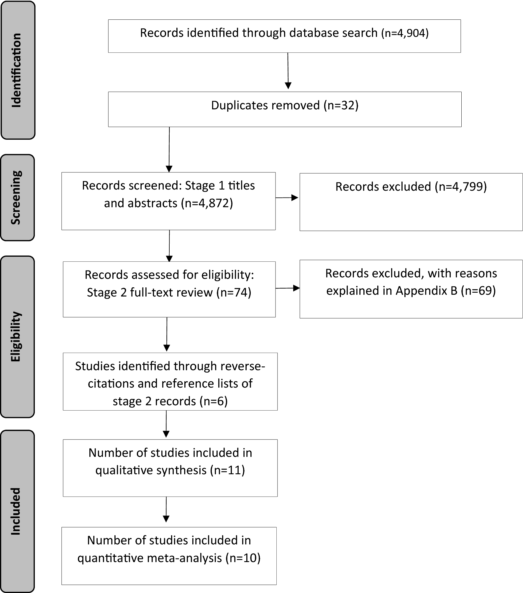 Titles and abstracts were screened by the first author and relevant information was collated using the Cochrane Collaboration data extraction form (Higgins et al. 2019). Reverse-citations and reference list searches were conducted by hand on eligible studies to identify any further relevant studies.