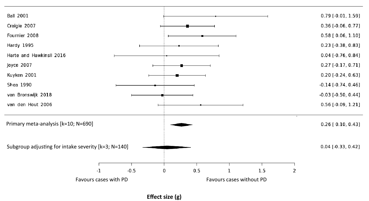 Eleven eligible studies (N = 769) were included in a narrative synthesis, and ten (N = 690) provided sufficient data for inclusion in random effects meta-analysis. All studies were rated as having “low” or “moderate” risk of bias and there was no significant evidence of publication bias. A small pooled effect size indicated that patients with PD had marginally higher depression severity after CBT compared to patients without PD (g = 0.26, [95% CI: 0.10, 0.43], p = .002), but the effect was not significant in controlled trials (p = .075), studies with low risk of bias (p = .107) and studies that adjusted for intake severity (p = .827). Furthermore, PD cases showed symptomatic improvements across studies, particularly those with longer treatment durations (16–20 sessions).