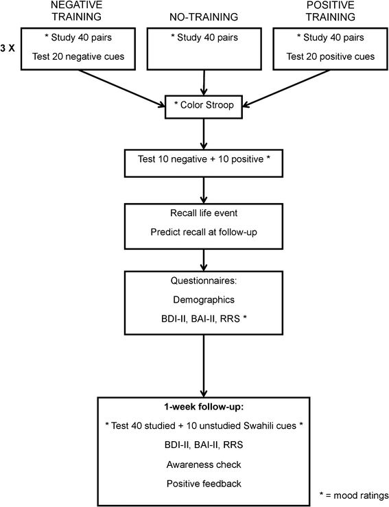 After the Stroop distraction, we tested recall of half of the translations. All participants saw 10 positive and 10 negative Swahili words for 10 s each and were instructed to type each translation within 10 s. Two fixed subsets of cues were created by randomly assigning words from the original list, and the role of the subsets (tested in Session 1 or not) was counterbalanced within each training condition. Following this test, autobiographical recall was assessed by asking participants to recall a personal life event that made an impression on them and to type its description. Instructions were deliberately simple and broad to potentiate transfer of training (see Hertel and Mathews 2011). Next, following the procedure established by Karpicke and Roediger (2008), they predicted how many of the 40 word pairs they would correctly recall after 1 week. At the end of Session 1 they answered demographic questions and responded to the BDI-II, BAI-II, and RRS, in that order.