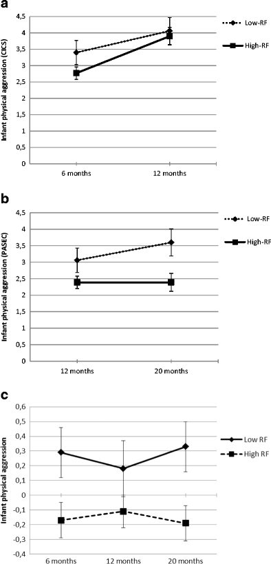 a. Infant physical aggression from 6 to 12 months for the group with low reflective functioning (RF) skills versus the group with high RF-skills as measured by the Cardiff Infant Contentiousness Scale (CICS) b. Infant physical aggression from 12 to 20 months for the group with low reflective functioning (RF) skills versus the group with high RF-skills as measured by the Physical Aggression Scale for Early Childhood (PASEC). c. Standardized infant physical aggression scores across time for the group with low reflective functioning (RF) skills versus the group with high RF-skills using the Cardiff Infant Contentiousness Scale at 6 months and the Physical Aggression Scale for Early Childhood at 12 and 20 months