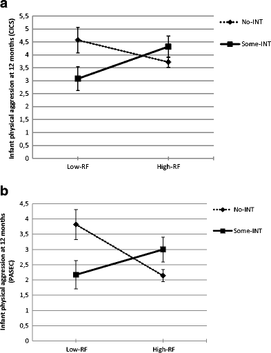 Two separate MANOVAs were conducted with the dichotomous measures of RF and sensitivity or intrusiveness as independent variables and infant aggression scores as dependent variables. The MANOVA with sensitivity confirmed the effects of RF-group. No effects were observed for SEN or SEN by RF-group. For the MANOVA with intrusiveness, the multivariate tests showed a trend effect for RF-group: F(4,89) = 2.03, p = 0.097; Wilk’s Λ = 0.92, partial η2 = 0.08. Also, a RF-group by INT effect was found: F(4,89) = 2.92, p < 0.05; Wilk’s Λ = 0.88, partial η2 = 0.12. Between-subjects effects showed a significant RF-group by INT effect for infant aggression at 12 months: F(1,92) = 7.82, p < 0.005, partial η2 = 0.08 for the CICS (see Fig. 2a), and F(1,92) = 7.94, p < 0.005, partial η2 = 0.08 for the PASEC (see Fig. 2b). A similar trend was observed for 20 months (p = 0.088). Additional t-tests to compare infant aggression at 12 months between both RF-groups per INT-group were conducted. For the some-INT group there were no differences between high and low-RF in reported aggression, but in the no-INT group, the low-RF group reported significantly more infant aggression compared to the high-RF group, CICS: t(64) = 1.99, p < 0.05; and PASEC: t(29.80) = 2.60, p < 0.05).