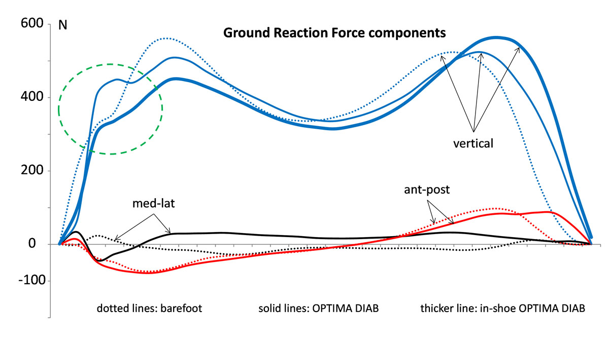 The OPTIMA DIAB (Molliter, Italy) is a special boot with an external rigid rocker sole, a fiber-glass rigid interface, a multi-layer modular insole, and a posterior rigid brace. To investigate forces at the boot external and internal interface, a Kistler force platform and an in-shoe Pedar baropodometer were used. The assessment protocol was applied to a healthy volunteer (F; 41years; BMI 19; high forefoot pressures; negligible foot extra-rotation; used to walk fast): 10 consistent footsteps per foot were simultaneously acquired by the two systems when the subject hit the platform; a high cadence of 110 steps per minute was acoustically imposed; the subject was acquired while walking barefoot (B), with primary prevention flexible shoes (F), with secondary prevention rigid shoes (R), with the OPTIMA DIAB without offloading (O), and with the OPTIMA DIAB with right central forefoot offloading (OS1). Pressure footprints were divided into 4 major regions [2]. All relevant parameters were averaged, with force and COP curves resampled before averaging.