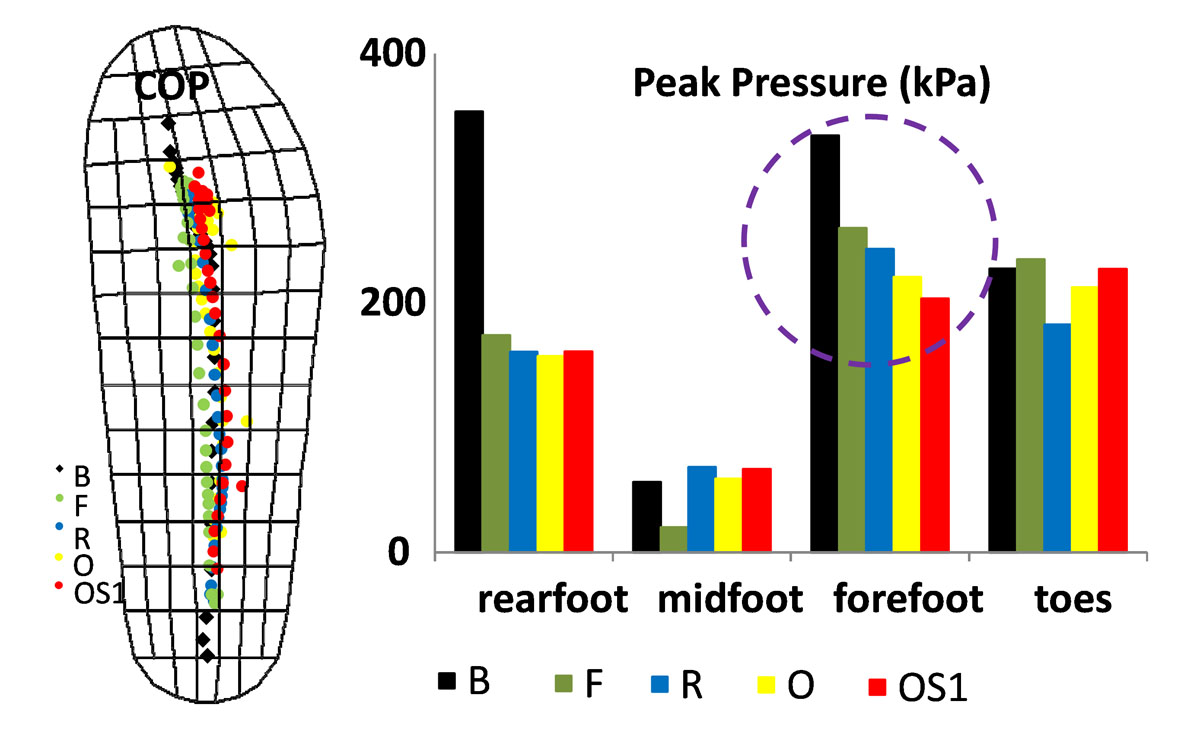 Mean COP trajectories under B, F, R, O and OS1 conditions; mean peak pressures under the same conditions and associated with rearfoot, midfoot, forefoot and toes. Curves and values have been averaged over 10 consistent trials.
