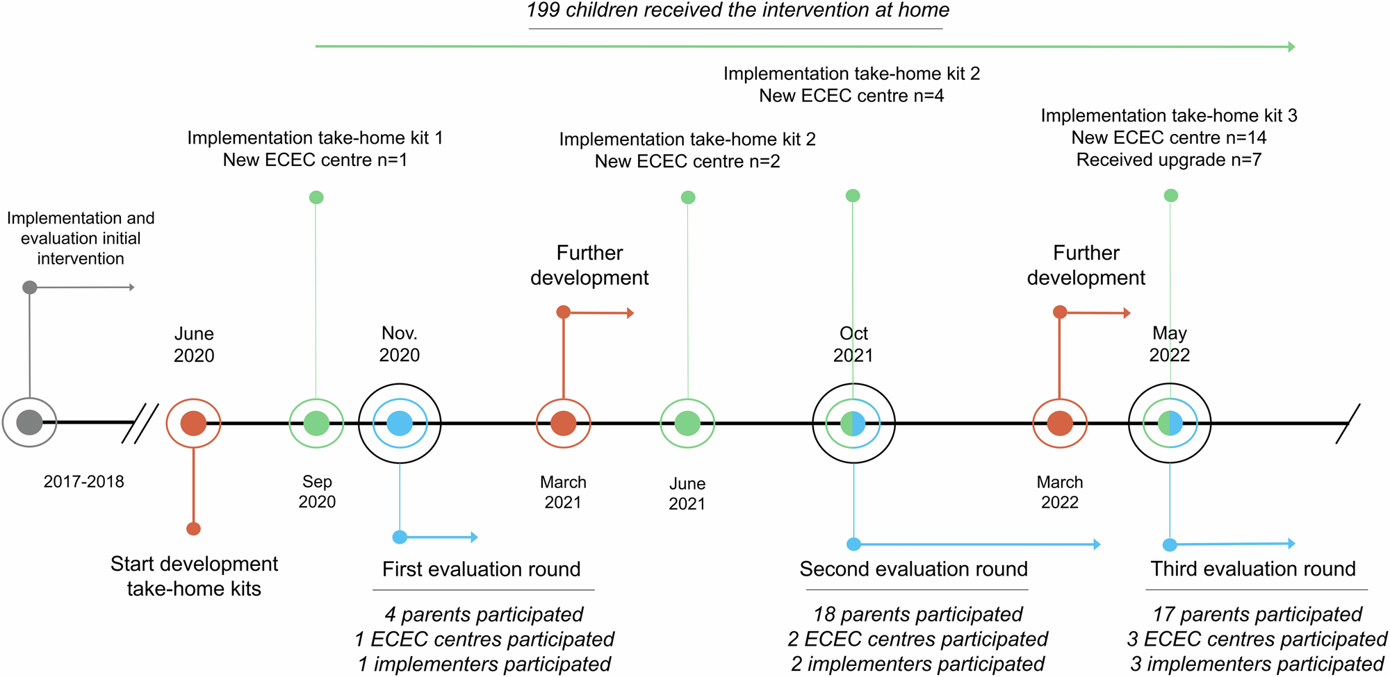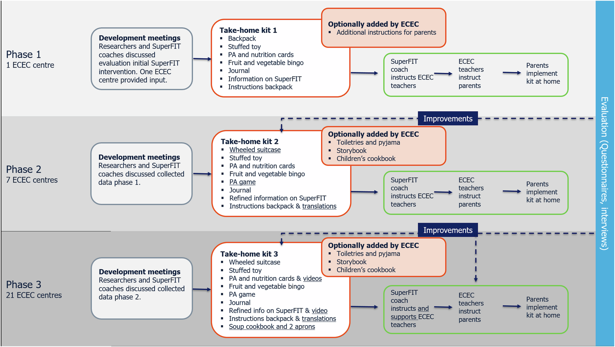 Finally, the SuperFIT coaches were asked to complete a logbook on whether the ECEC centres had adopted the take-home kit, any adaptations to the contents of the take-home kit (i.e. materials added), and the number of children who had received the take-home kit. This was done separately for each ECEC centre separately, with input from the ECEC teachers.