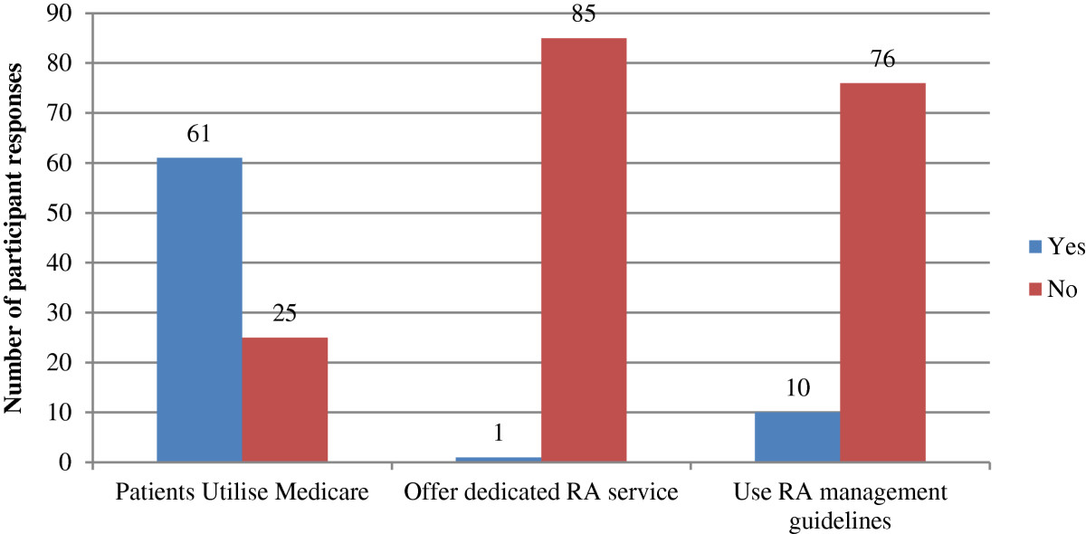 Descriptive data regarding access to specific foot care/treatment characteristics are presented in Figure 6. The majority of participants indicated that their RA patients would have access to routine foot care components such as nail care. However several respondents indicated patients with RA would not have access to more specialised foot care/treatments at their practice such as intra-articular corticosteroid injections and customised footwear.