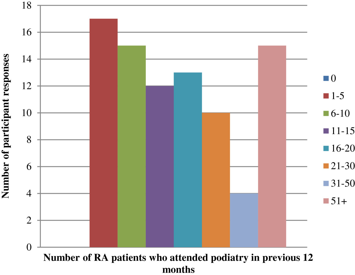 Bar chart describing respondents’ responses to the question “How many patients with RA attended your practice for foot care in the previous 12 months?”.