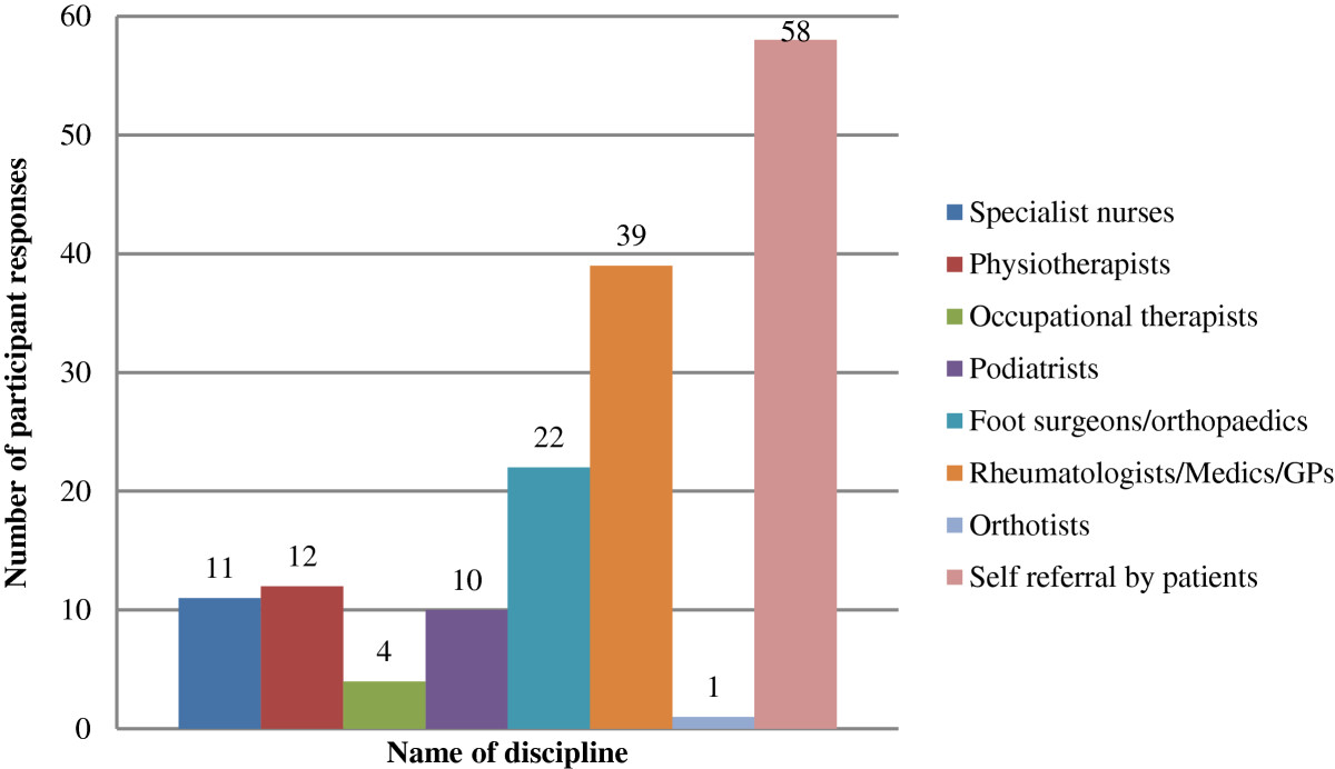 Currently, little is known about referral pathways to podiatry for RA patients. An important finding in the current study was that the main route to podiatric foot care was by patient self-referral. A recent study has reported that patients with RA are predominantly responsible for choosing to access foot care service [20]. However, there is growing evidence to suggest that patients with RA may not be suitably equipped with the knowledge and understanding of their disease-related foot problems and therefore do not undertake timely self-referral to podiatry [3, 20‐22]. Therefore, there appears to be a significant need for increased awareness and uptake of rapid foot care referral guidelines amongst multidisciplinary rheumatology teams and podiatry services [10]. The main referring physicians of RA patients to podiatry identified in this survey were rheumatologists/doctors/general practitioners (GPs). This is perhaps unsurprising as Australian general practice guidelines for the management of RA stipulate that access to appropriate foot care should be strongly supported by GPs [1].