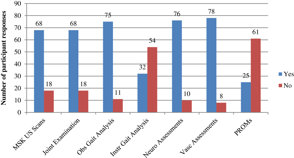 Descriptive data regarding access to specific foot examination/assessment characteristics are presented in Figure 5. Generally respondents indicated that RA patients could access most examinations/assessment methods at their practices. However, 61 (71%) respondents indicated that they did not administer patient-reported outcome measures (PROMs) to monitor their RA patients. Fifty-four respondents (63%) also indicated that there was no access to instrumented gait analysis. Adequate access to examinations of individual foot joints for tenderness and swelling, and musculoskeletal ultrasound scans were not available for 18 (21%) respondents’ practices respectively.