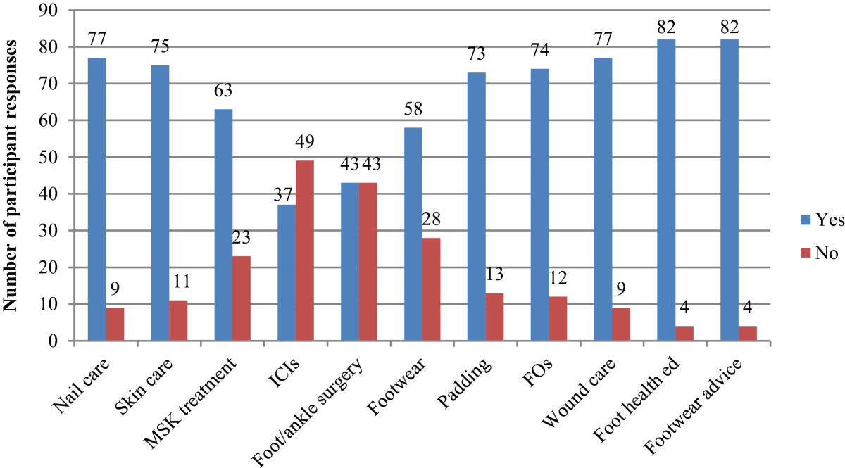 Bar chart indicating the number of ‘yes/no’ responses to the question regarding foot health treatments “Do your patients have adequate access to services providing for these needs:-”.