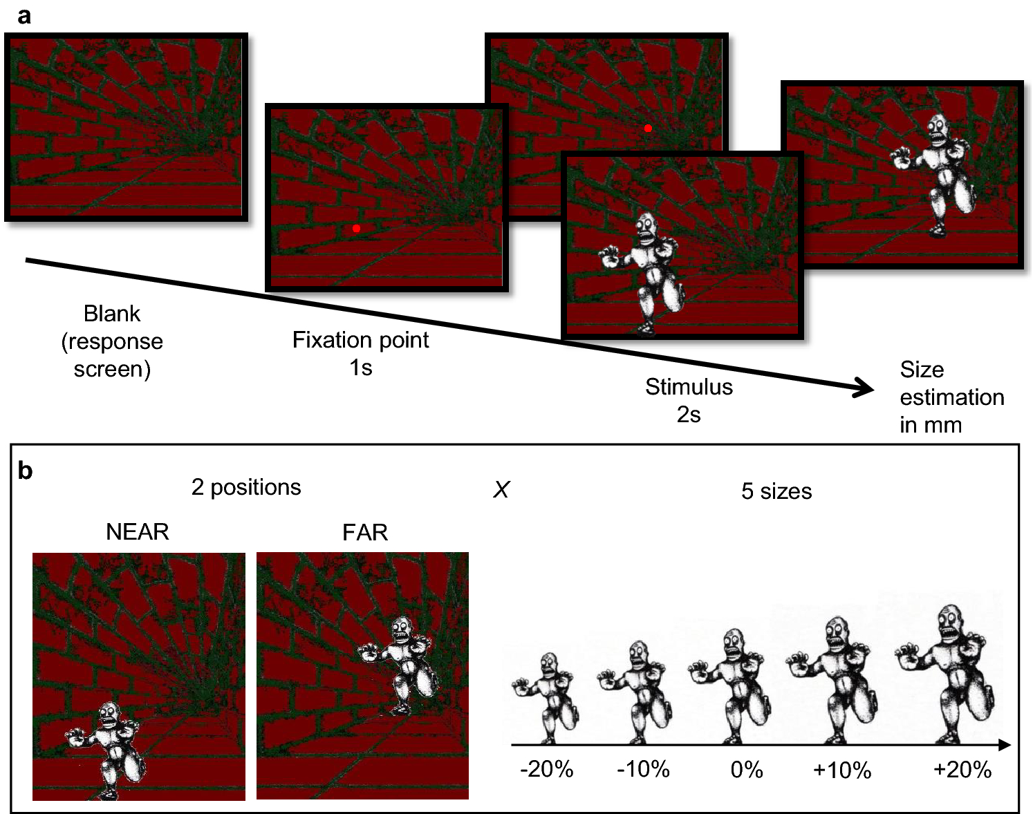 The experiment was performed in a quiet dark room (no lighting; windows obscured with shutters). Participants sat in an experimental boot inside thick black curtains that further shut off any ambient light. Thus, the only illumination was provided by the stimulus display, identical for all participants. This was a CRT monitor screen (40 × 30°, Barco Calibrator, resolution of 1024 × 768 pixels and a refresh rate of 120 Hz), placed at a distance of 57 cm from the participant’s head, which was stabilized by chin rest. Viewing was binocular. Stimuli were created by modifying a well-known example of the Ponzo Illusion. White figurines (with a luminance of 55 cd/m2) representing a monster were shown against a steady background creating a 3D context (corridor) with equiluminant red/green elements (green: 1.7 cd/m2; red: 2.0 cd/m2). Stimuli were generated with the PsychoPhysics Toolbox routines (Brainard 1997; Pelli 1997) for MATLAB (MATLAB r2010a, The Math Works) housed in a Mac Pro 4.1. Five figurines were used, with height varying between 6.2 and 9.3° in steps of 0.8° (the width varied proportionally). On each trial, a single figurine was presented, positioned to appear standing at the near-end or far-end of the corridor (see Fig. 1).