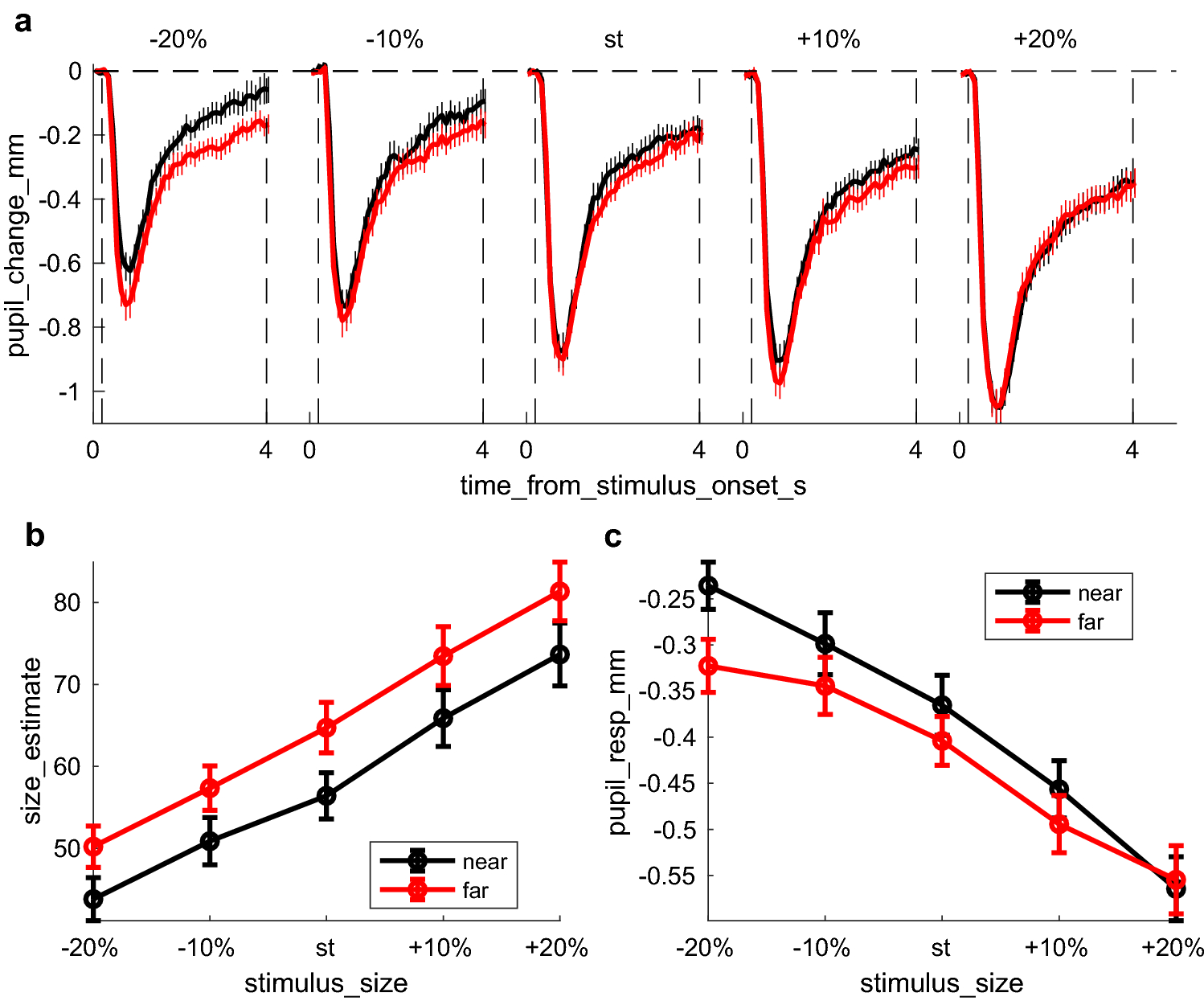 Ponzo illusion measured with perceptual reports and pupillary responses. a Timecourses of pupil change relative to baseline (first 200 ms from stimulus onset), plotted separately for the near (black) and far (red) conditions and for the five stimulus sizes (from ± 20% the standard size); dashed lines indicate the window over which pupil changes are averaged to compute the pupil response (whole trial duration except the initial 200 ms used to define pupil baseline). Thick lines show averages across participants, thin lines ± 1 s.e.m. b Mean magnitude estimates of the figurine size. Separate lines are for the near (black) and far (red) conditions and estimates are plotted against stimulus size, with error bars giving standard errors across participants. c Mean pupil responses (pupil change averaged in the window defined by dashed vertical lines in a, corresponding to the whole stimulus duration except the initial 200 ms used to define pupil baseline). Same format as in b