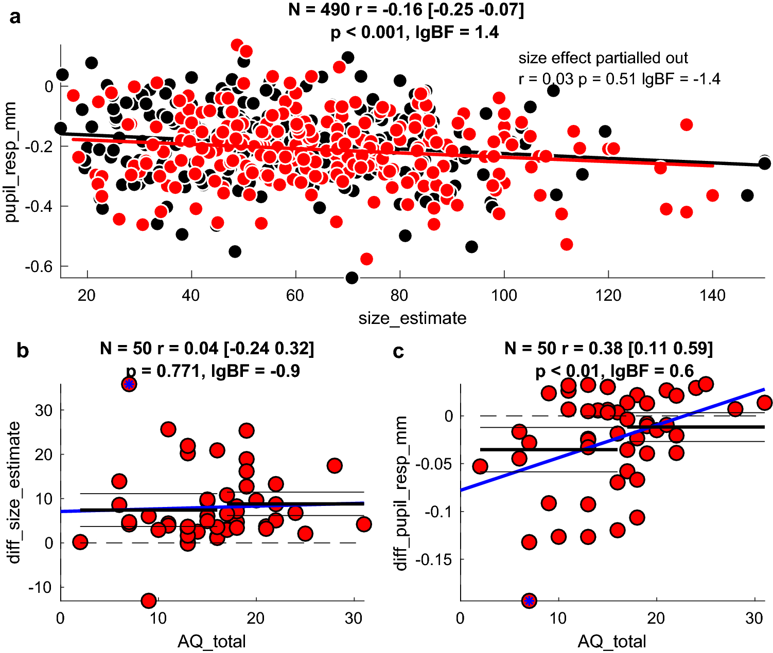 Association between illusion magnitude and Autistic Quotient scores. Correlation analyses: legends report the number of points entered the correlation analysis, the Pearson’s rho coefficient and its confidence interval; the associated p-value and lgBF, or the logarithm with base 10 of the Bayes Factor (see “Methods”). a Correlation between pupil responses and size estimates. Each participant is represented by a maximum of 10 points, one for each stimulus size and condition (missing points are for invalid trials/failed pupil measurements). Thick lines show the best fit linear regression across the data points of the corresponding color. After partialling out the effect of stimulus size, the correlation between pupil responses and size estimates becomes non-significant (text inset). b Psychophysical estimate of illusory size (pooled across stimulus size) plotted against AQ scores. Each participant is represented by 1 point, given by the subtraction of the mean response to figurines at the far-end minus the near-end of the corridor. The two measures were not correlated (see legend). The thick blue line shows the best fit linear regression across the data points and horizontal black horizontal lines (thick and thin) show the illusion size (mean and 95% confidence intervals) in participants with lower and higher AQ scores, defined by a median split. c. Pupillary response to illusory size (pooled across stimulus size) plotted against AQ scores. The correlation remains significant at p < 0.05 after removing the participant with the most extreme value (marked by the blue asterisk). The thick blue line shows the best fit linear regression and the black horizontal lines show the median split analyses: the pupil size modulation is non-significantly different from 0 for individuals with higher AQ scores (> 16, the median of our sample); for individuals with lower AQ scores, it is significantly below 0 (implying enhanced pupil constriction in response to figurines on the far-end of the corridor)
