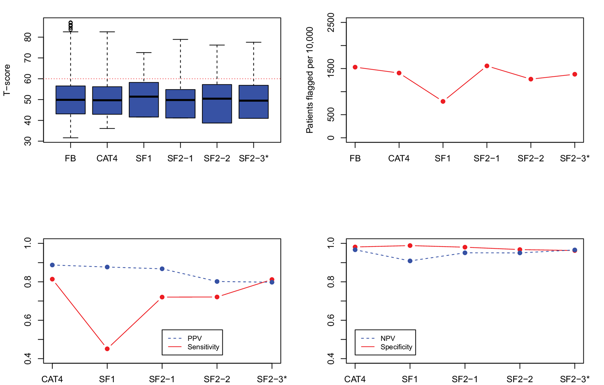 A final potential limitation is that sensitivity and PPV values of 0.80, while reasonably high, also imply false negative and false discovery rates of 20%. Our results suggests that longer measures could further increase sensitivity and PPV, but additional investigation would be needed to confirm this and evaluate the gains attributable to SF length and longer CATs. However, regardless of the improvements beyond 0.80, this would need to be weighed against the benefit of the time savings in routine care by administering very short screeners, requiring approximately 2 minutes of patient time for 10 items total [41].