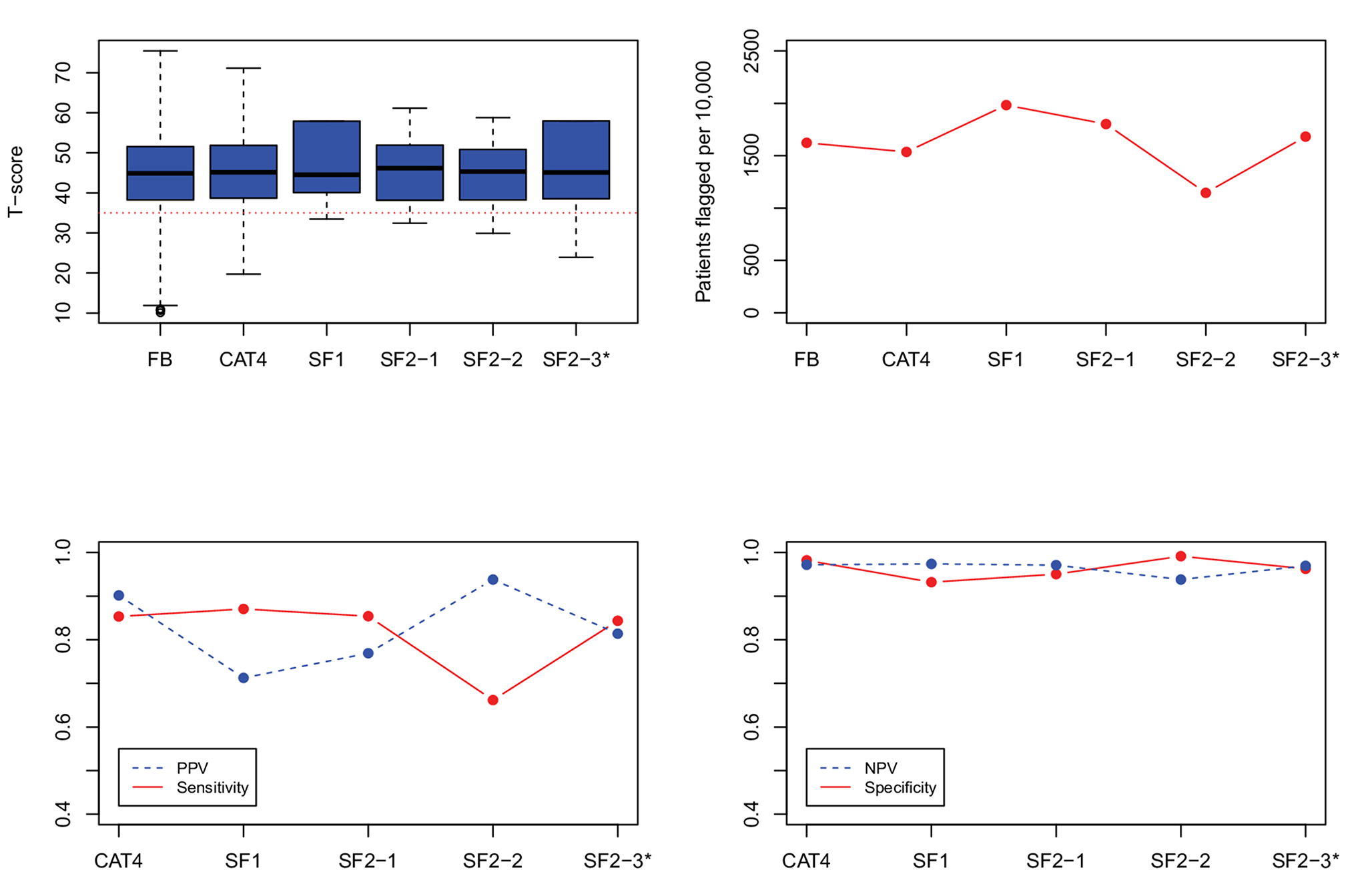Physical Function. Figure 5 (Physical Function), top left panel, shows that the SF2-1 and SF2-2 have minimum values close to the clinical threshold. They also deviate more than SF2-3 from the numbers of simulated patients flagged by the full bank. The bottom left panel shows that the sensitivity of SF2-2 was relatively poor (0.66). The PPV of the SF2-3 was slightly higher than the SF2-1, while the sensitivities of these 2 forms were similar. Taken together, we chose SF2-3 on this basis and a preference for the item content. (Interested readers can see results for additional clinical thresholds as Supplementary Figs. 1–5 S.)