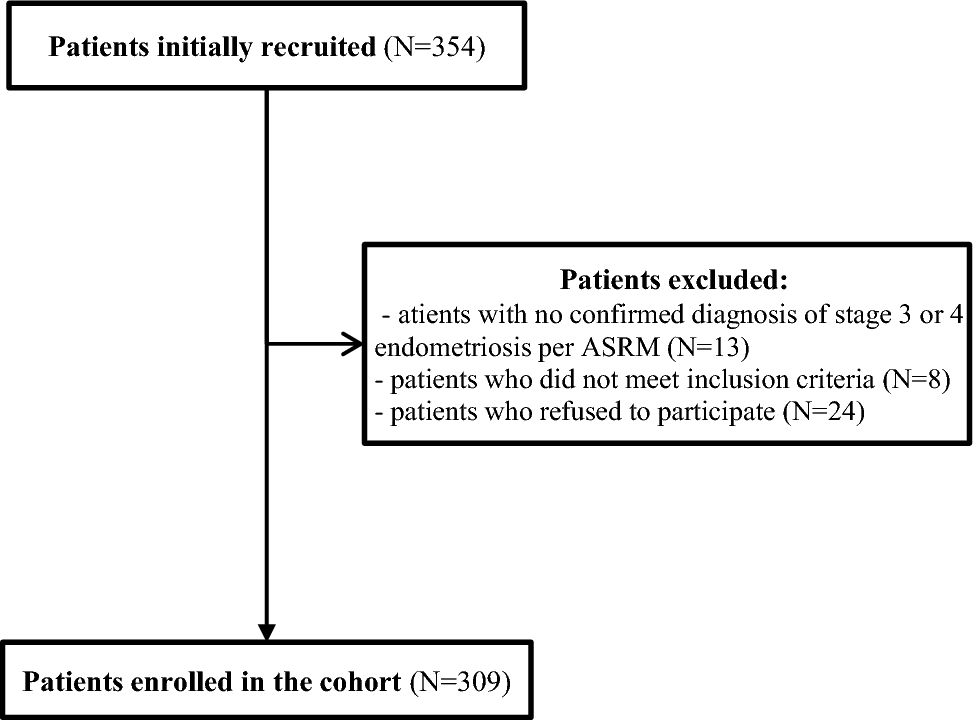 Each study participant was informed about the aim of the study and provided with instructions on how to answer the questions. All participants completed the questionnaire by themselves, with no assistance. 354 surveys were distributed, and 309 correctly completed surveys were returned. 13 patients were not included because they did not meet the endometriosis stage criterion, 8 did not meet other inclusion criteria, and 24 refused to participate (Fig. 1). Survey completion time was approximately 15 min. Return rate was 87.28%.