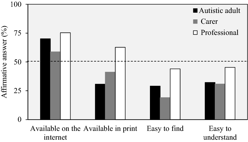 Among all groups, the majority reported that the information on how to get a diagnostic evaluation for autism in adulthood was available on the internet, although these proportions were lowest for autistic females and carers of adults needing a high level of support. In contrast, less than 50% of autistic adults or carers reported that information on how to get an autism diagnosis in adulthood was available in print, whereas the majority of professionals reported that print material was available. This difference in reported availability of information on the internet or in print by autistic adults and carers should be investigated further to determine if disparities in access to the internet is a barrier to accessing diagnostic services information. Also, of concern was the evidence that less than half of respondents among all the categories reported that information on how to get a diagnosis was easy to find or to understand and these proportions were lowest for autistic females and carers of adults that need high support. Indeed, a more difficult experience by females during the diagnostic process has been observed in Siklos and Kerns (2007). Further, more than 20% of professionals did not know if diagnostic information was easy to find or understand.