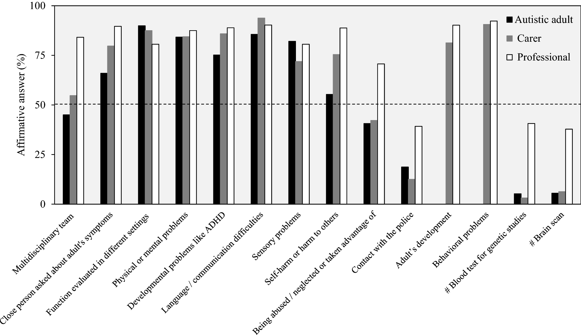 Among the three groups, more than the 55% of the responders reported to have experienced the majority of recommended features for the autism diagnostic process for adults including: a close person was asked about the adult’s symptoms, assessment of self-harm or harm to others, presence of language/communication problems, physical or mental conditions, sensory problems, and neurodevelopmental conditions like ADHD, and evaluation of functioning in different settings. For more than a half of professionals, consultation with other experts, evaluation of autistic core behaviors, use of standard tests for autism, tests for cognitive or psychological functioning, and physical examination, were considered as standard routine practice. One of the recommended features—evaluation of police encounters—was, however, experienced by less than 50% of all 3 groups. Further, the recommendation to evaluate a history of abuse was experienced by < 50% of autistic adults and carers while 71% of professionals reported it as a routine practice or often considered. There were notable gender differences in some responses, specifically evaluation of developmental problems, sensory problems, being abused/neglected or being taken advantage of were reported more often by autistic females, while evaluation of contact with the police was reported more often by autistic males. The features that were recommended to NOT be part of the diagnostic process (neuroimaging; genetic tests) were in fact experienced by only a small the minority of adults and carers (3–6%), although around 41–66% of professionals claimed that these NOT recommended features were standard routine or often considered. Again, there was some gender difference with autistic males more often than males reporting that they had experienced the features that were NOT recommended. In summary, results showed that most recommended features of the diagnostic evaluation are often experienced by users and professionals. However, there is room for improvement and in particular regarding evaluation of potential abuses or police encounters and avoiding inclusion of such features as genetic test and brain scan in routine practice. Further, the potential gender differences highlight the need to consider gender in studies of autism diagnosis services.