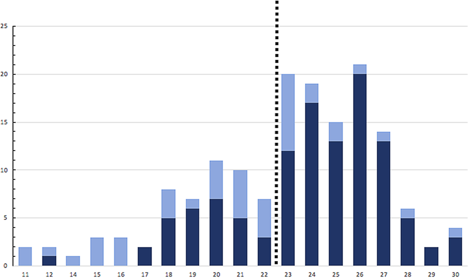Distribution of Montreal Cognitive Assessment test scores and assessment by clinician. A score of 22 (0–30) or less is indicative of cognitive impairment. Impression of clinician: dark blue no cognitive impairment, light blue cognitive impairment