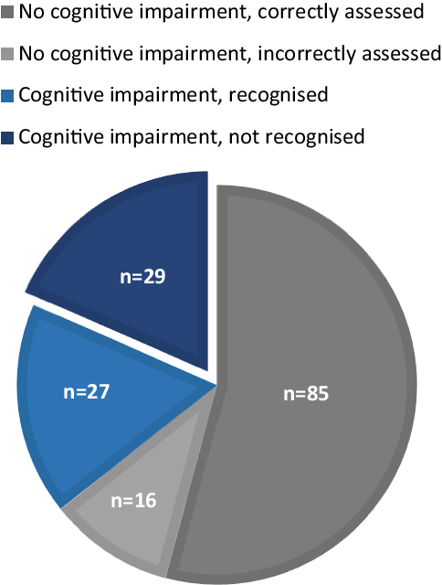 Of the 56 patients with cognitive impairment, 29 (52%) were not recognised as such by the clinician during the visit at the outpatient clinic. The sensitivity of assessment of cognitive impairment by the clinician was 48%. The specificity was 84% (Fig. 2).
