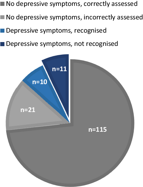 Of the 21 patients with symptoms of depression, 11 (52%) were not recognised as such by the clinician. The sensitivity of the assessment of symptoms of depression by the clinician was 48%, the specificity was 85% (Fig. 3).