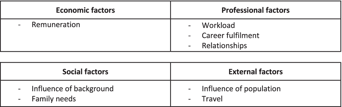 Professional factors encompassed the sub themes of workload and work type, career fulfillment, and interprofessional relationships. Participants viewed the move to rural practice as an opportunity to become self-employed and an easy way to find work:
