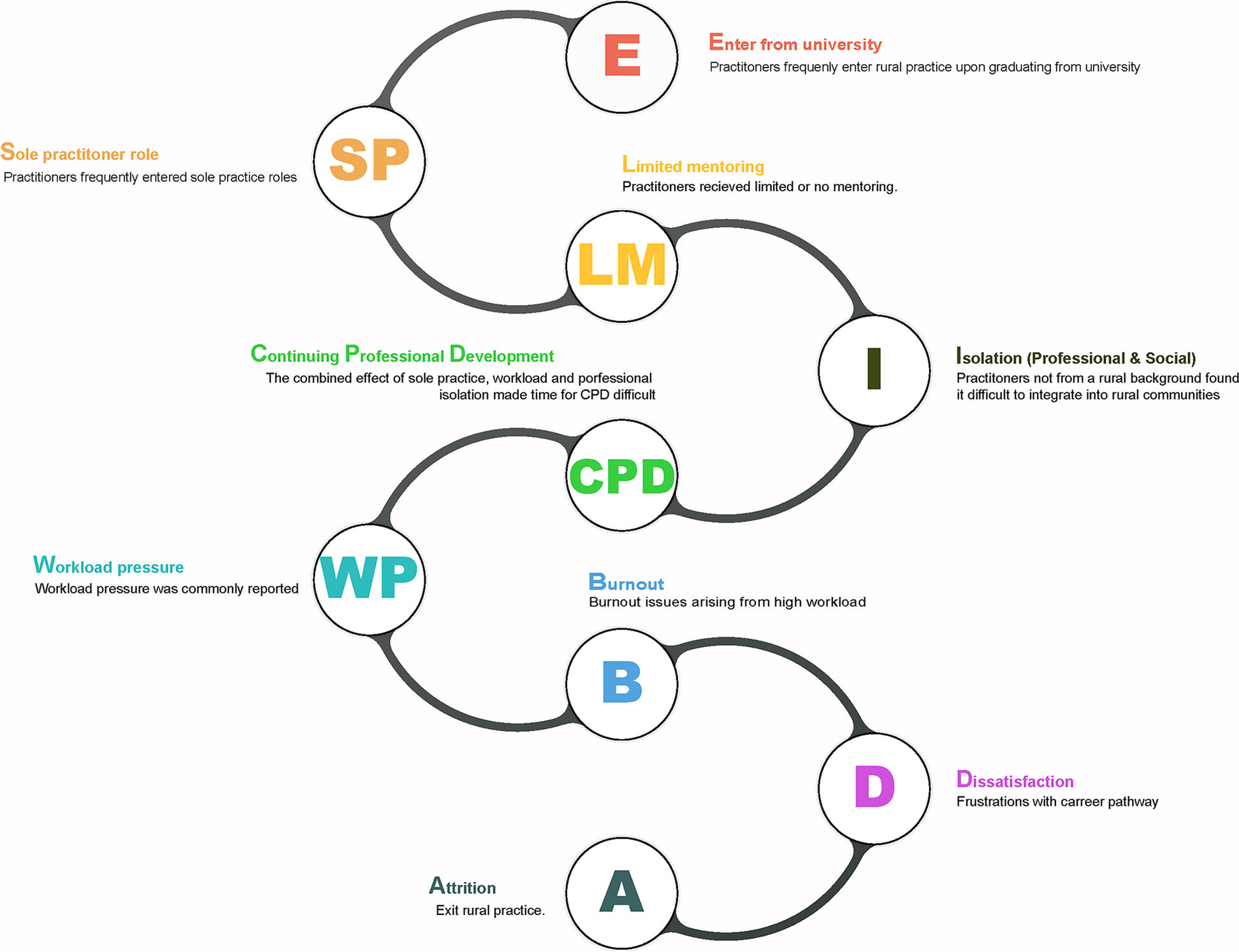 The current study has revealed that the ability to retain new podiatry practitioners may stem from a cycle of events set in place when they first enter the rural workforce. Figure 2 summarises these events as a proposed model of rural workforce attrition. For new graduates entering the workforce the establishment of mentoring and supportive peer networks is imperative to aid both professional support and continued development [28]. However, in the current study, a feeling of professional isolation born from limited support networks was common amongst rural practitioners. Being away from immediate family, difficulty fitting in with the community, having no established network of friends, no people of similar age to socialize with, and difficulties making friends compounding the feeling of isolation. The potential effects on both professional and personal development of an inexperienced practitioner working as a sole practitioner in relative isolation could lead to negative health consequences and ultimately attrition. Professional isolation has been reported in Australian based healthcare workers as a factor that negatively influences rural workforce retention [20, 22].
