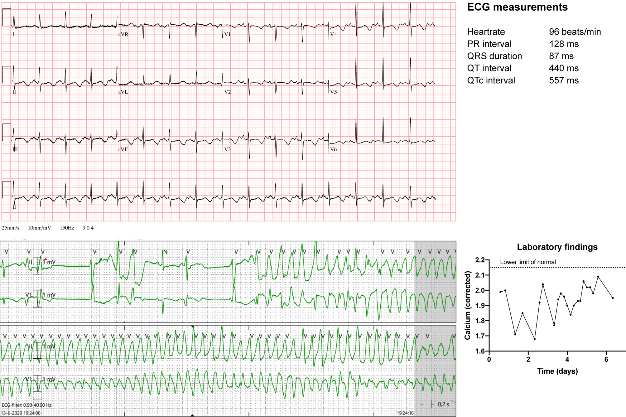 Upper Electrocardiogram demonstrating QT prolongation and ST‑T changes attributable to hypocalcaemia. Lower left Rhythm recording of the development of torsades de pointes ventricular tachycardia. Lower right Graph depicting the serum calcium levels over time