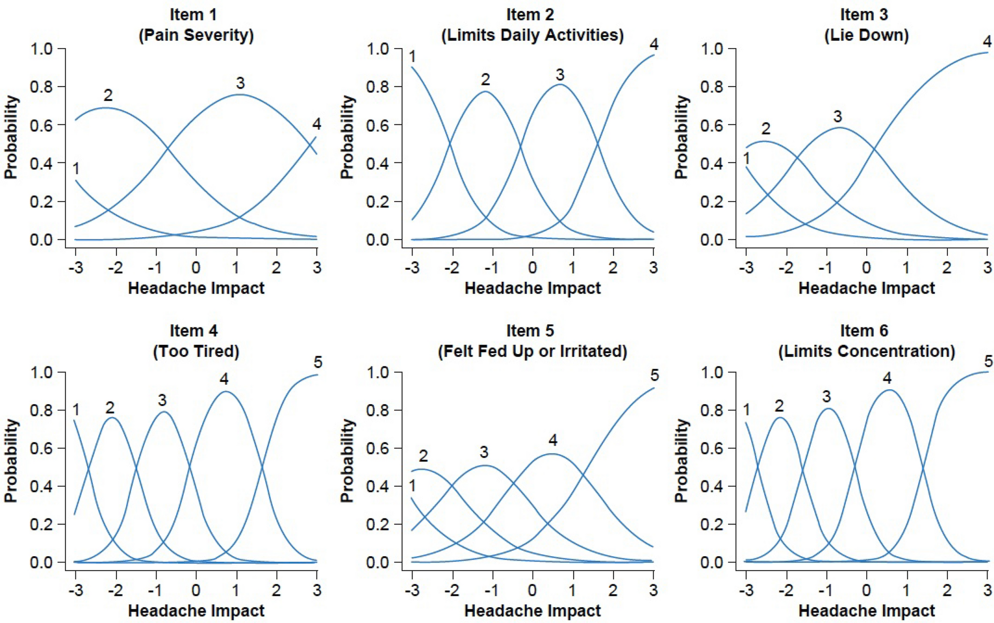 The HIT-6 [13] measures the impact and effect of headache on the ability to function normally in daily life, and consists of six questions, each with five verbal response categories. Per the HIT-6 User’s Manual [22], the following values are used to score responses: never = 6, rarely = 8, sometimes = 10, very often = 11, and always = 13; these category weights were selected so that HIT-6 summed scores would correspond as closely as possible to scores from response pattern-based IRT scoring [13]. The total score was obtained by summing the responses to all six items using item weights just specified. Scores ≥ 60 were indicative of severe life impact, 56–59 of substantial life impact, 50–55 of some life impact, and ≤ 49 of little to no life impact. For the reported item-level analyses (item-level descriptive statistics, latent variable modeling, classical test theory analyses), the ordinal HIT-6 responses were coded as: never = 1, rarely = 2, sometimes = 3, very often = 4, and always = 5.